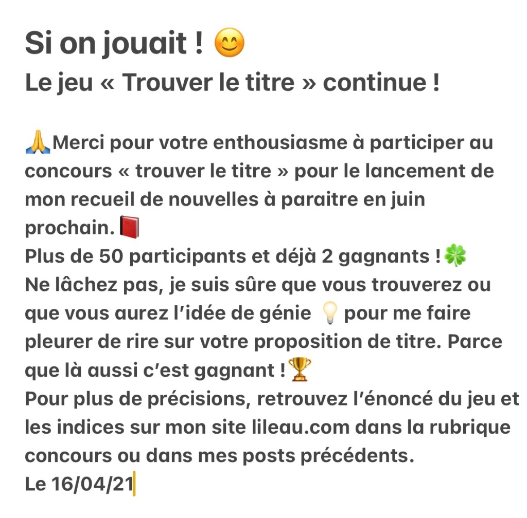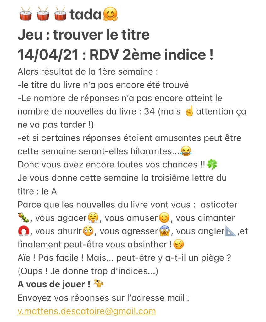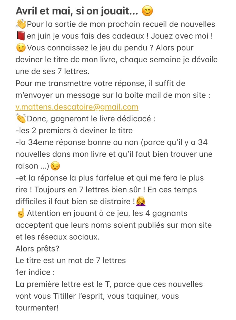 Jeu : trouver le titre Partager : Partager sur X(ouvre dans une nouvelle fenêtre) X Partager sur Facebook(ouvre dans une nouvelle fenêtre) Facebook J’aime chargement… Publié par vmattensdescatoiregmailcom Voir tous les articles par vmattensdescatoiregmailcom